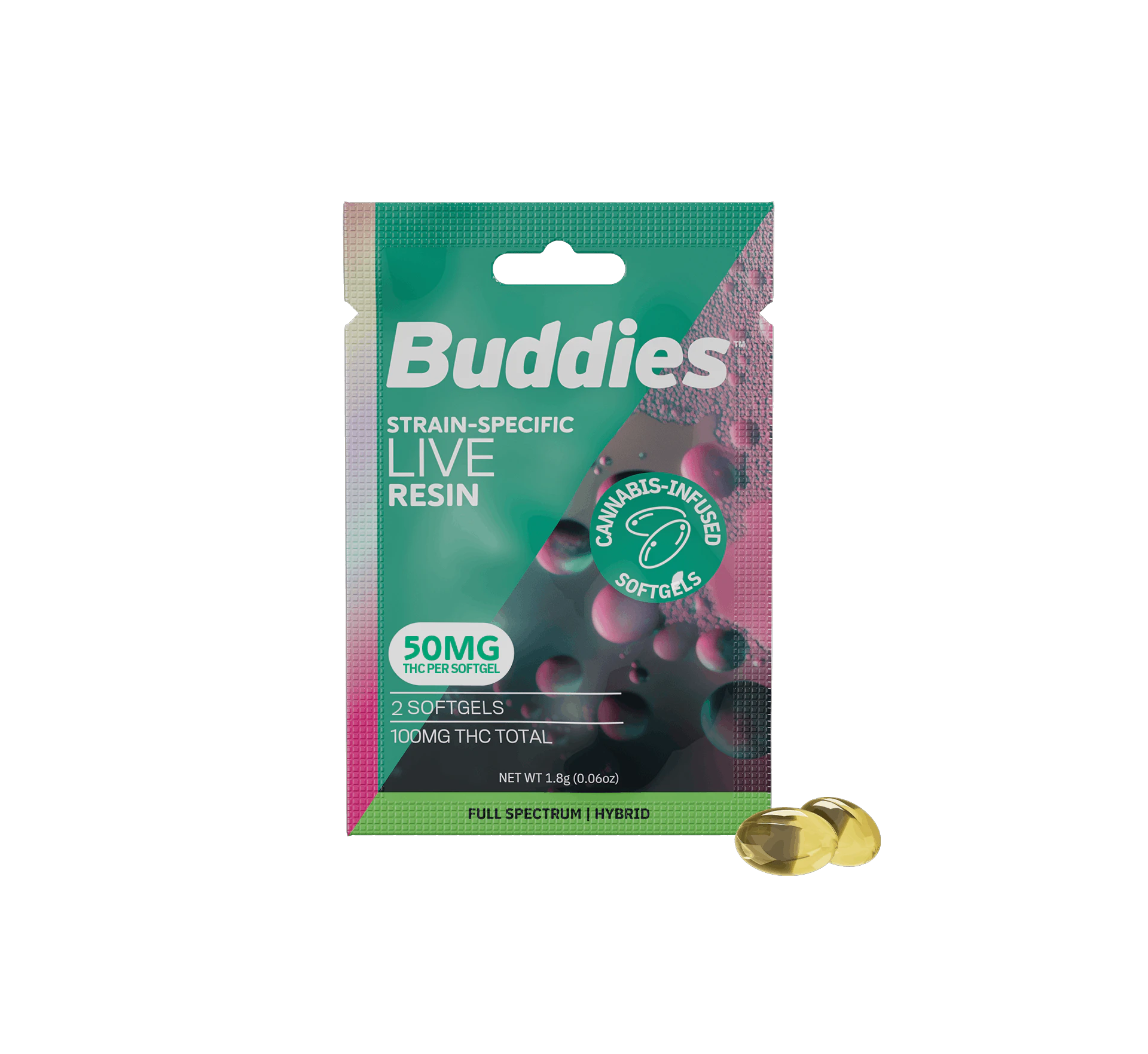 LIQUID LIVE RESIN SOFTGELS Experience Buddies’ high-quality Live Resin formula with maximum convenience with our pharmaceutical grade softgels. Available in bottle and trial sizes, each softgel captures a full spectrum of strain-specific cannabinoids and terpenes, providing a synergistic effect ideal to a well-rounded cannabis experience. Conceived to pair precise dosing with a discreet form, our softgels are perfect for any situation and ideal for those who prefer a method that’s familiar. Ingredients: Gelatin, Glycerine, MCT Oil, Cannabis Extract