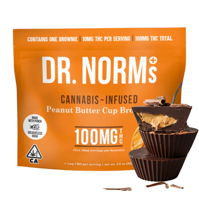 Dr. Norm's Peanut Butter Solventless Hash Brownie is loaded with delicious peanut butter cups, peanut butter chips, and decadent chocolate! It is powered by Punch Extracts HASH and is the first solventless baked good in CA! It is great for low, medium, and high tolerance patients as it is a 100mg bar that comes with a dosing guide for how to cut into ten 10mg pieces.