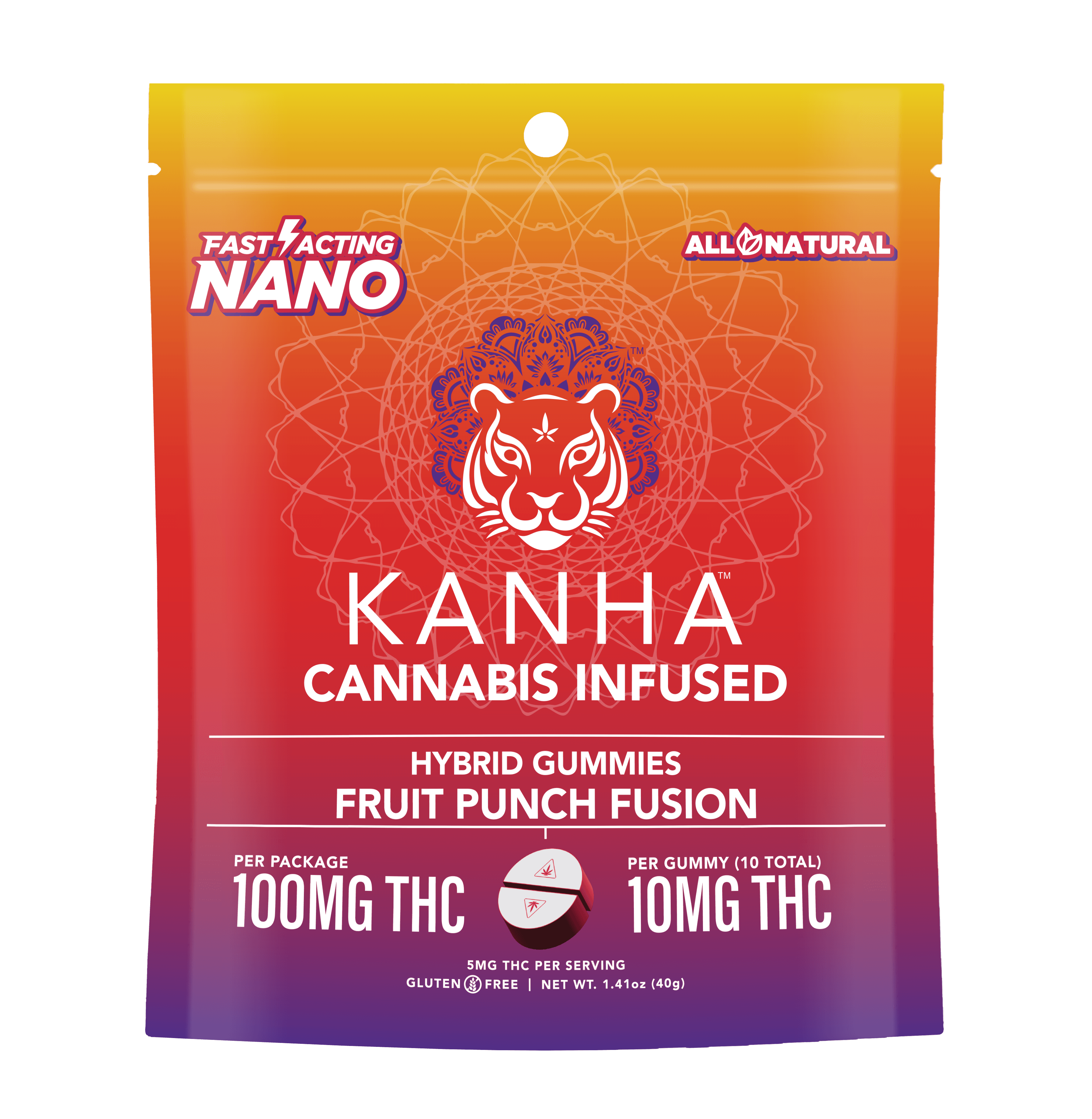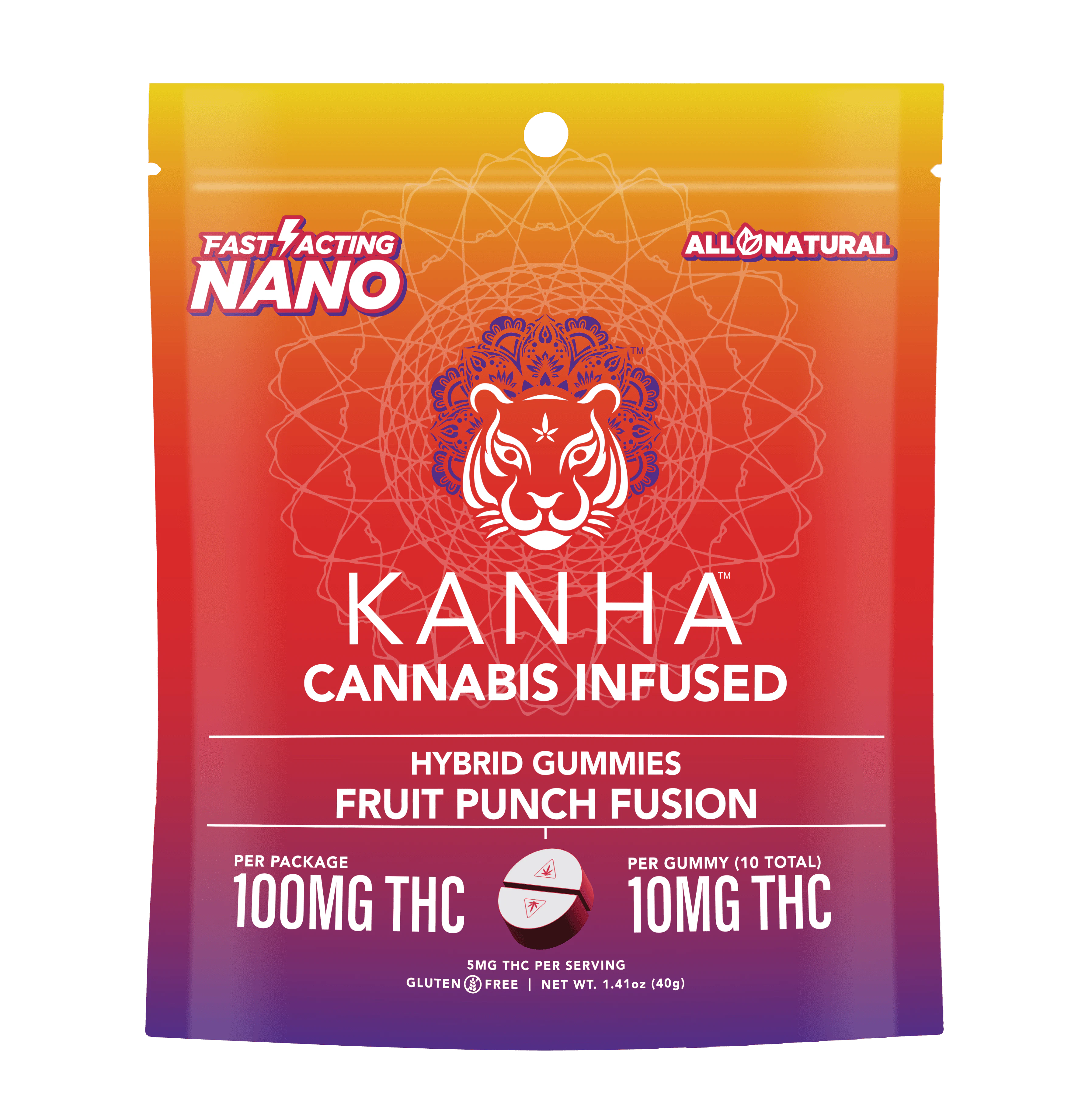 KANHA NANO Hybrid Fruit Punch Fusion 10 pieces x 10mg/gummy = 100mg/bag Fruit Punch Fusion refreshes the body and soul with tart apple, citrus and tropical fruit flavors paired with the highest-quality hybrid terpenes like α-bisabolol, α-pinene and peppery β-caryophyllene. Each all-natural, fast-acting gummy features 10mg of lab-tested THC and our exclusive VESIsorb nanotechnology for soothing, uplifting experiences that take effect in a matter of minutes. Fresh and fun like a warm summer breeze, Fruit Punch Fusion delivers big sunny smiles all year long. Instructions: Eat 1 gummy. Onset starts around 5-15 minutes. Wait 60 minutes for full effect. Keep in a cool, dry place. Avoid temperatures over 75°F. Ingredients: Tapioca Syrup, Cane Sugar, Water, Gelatin, Agar, Modified Corn Starch, Locust Bean Gum, Debittering Flavor, Carnauba Wax, Citric Acid, Natural Flavor, Natural Color, Cannabis Oil, and VESIsorb Nanotech.