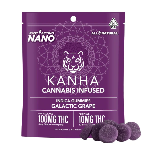 KANHA NANO Galactic Grape Indica Gummies 10 pieces x 10mg/gummy = 100mg/bag Who needs wine when Galactic Grape Indica gummies deliver the flavor of harvest-ready grapes with reserve-worthy indica oil and terpenes like myrcene, α-humulene and β-caryophyllene. Each soft and juicy gummy contains 10mg of THC and our exclusive NANO technology for faster takeoffs that send you into orbit in minutes. KANHA, the first to introduce fast-acting effects, remains the best with NANO gummies. Instructions: Eat 1 gummy. Onset starts around 5-15 minutes. Wait 60 minutes for full effect. Keep in a cool, dry place. Avoid temperatures over 75°F. Ingredients: Tapioca Syrup, Cane Sugar, Water, Gelatin, Agar, Locust Bean Gum, Carnauba Wax, Natural Flavor, Citric Acid, Natural Color, VESIsorb Nanotech, and Cannabis Oil.