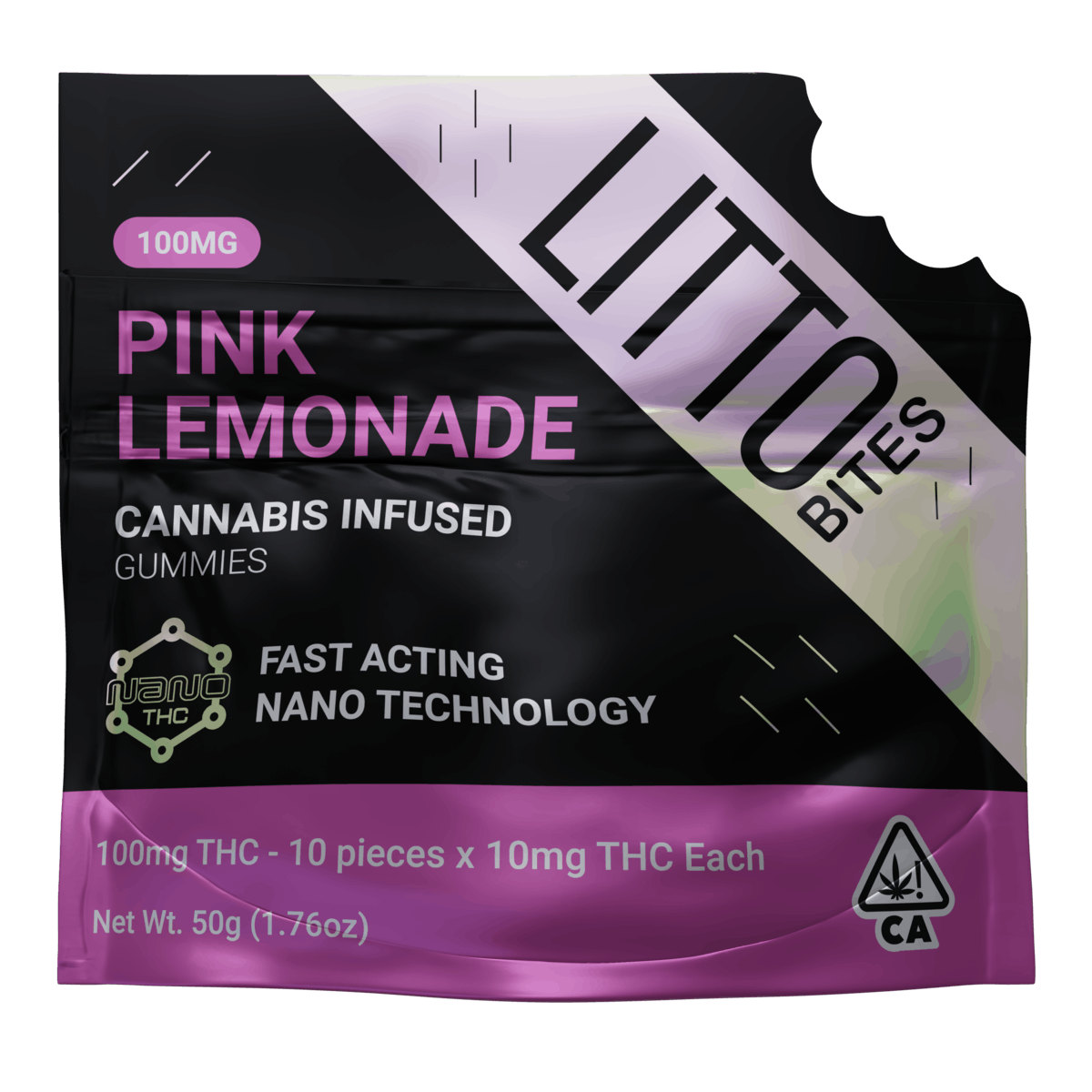 Mood Add a splash of fun and relaxation to any moment with Pink Lemonade! Made with nano-technology, allow its lighthearted and bright effects to hit after 10-15 minutes! Your new favorite for kicking back and enjoying the little things, LITTO Bites in Pink Lemonade offers a fresh and feel-good high, as bright as a perfect summer day. Flavor Summer days are one bite away with LITTO Bites in Pink Lemonade! Transport yourself to the nostalgic vibes of your favorite summer memories and indulge in the light refreshing taste of tart lemons with a touch of candy-like sweetness! Bursting with the perfect balance of sweet and sour flavor, just like taking a sip of an ice-cold lemonade on a hot summer day. • 10MG THC Per Piece • Comes in 1 Pack (10MG) and 10 Pack (100MG) • Made with Fast Acting Nano Technology • Vegan • Gluten-free