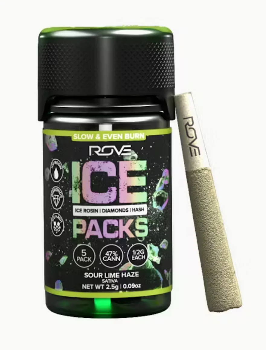 Rove Ice Packs prerolls, the world’s first triple-infused preroll. Made with premium-grade flower fully-infused with THCA diamonds and solventless ice hash rosin, expertly rolled and coated in more ice hash. Super smooth and ultra potent, Rove Ice Packs test up to 50% THC. Welcome to the next evolution of prerolls.