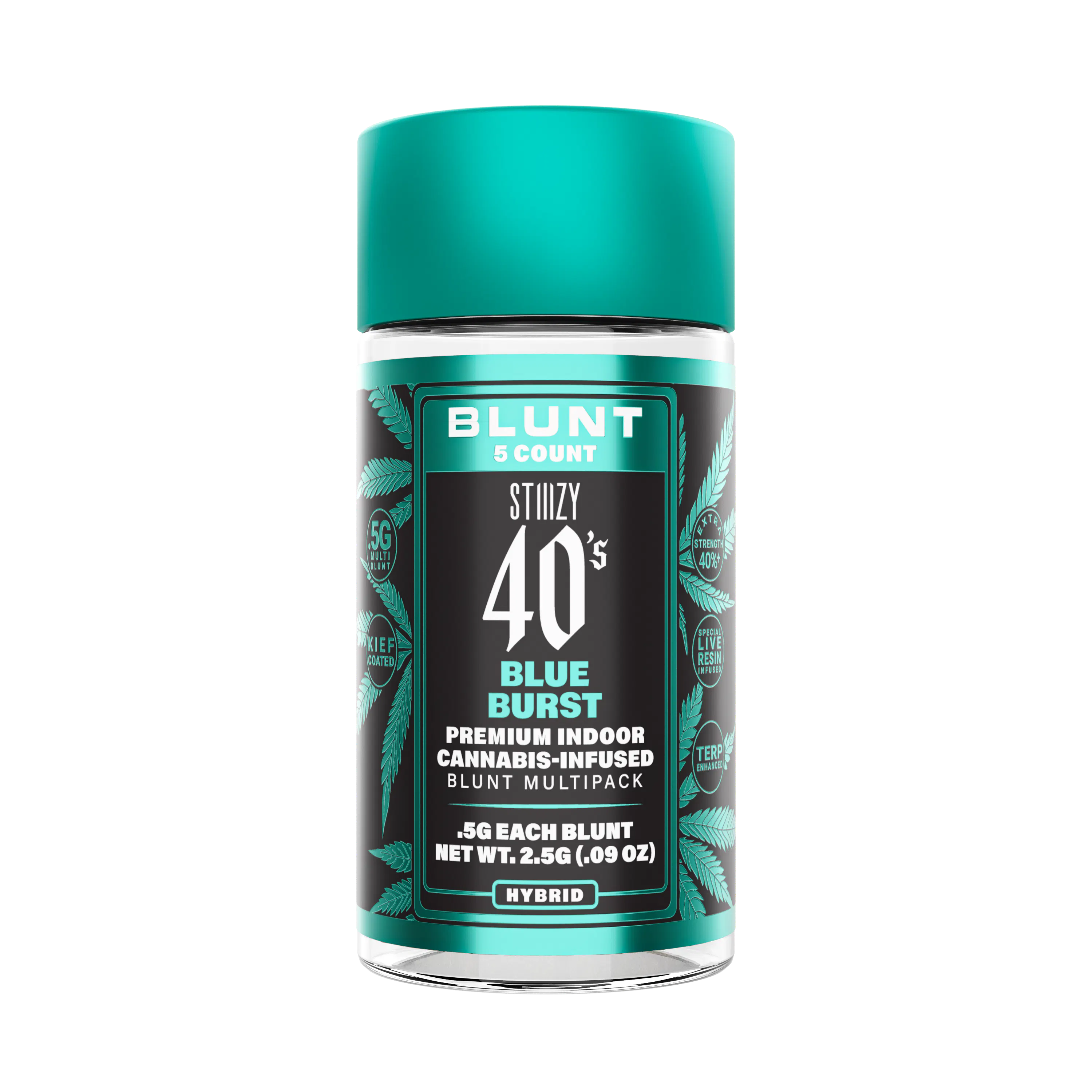 STIIIZY 40’s Mini Blunts Multipack is filled with premium grown STIIIZY cannabis and packed in individual glass vials to maintain freshness and potency. Each 40’s Mini Blunt is rolled with 100% tobacco free, kief dusted hemp wraps which packs a flavorful and potent punch with every exhale, and the tightly secured custom glass tips have been perfected to provide an amazing and consistent burn every time. The STIIIZY 40’s Mini Blunts Multipack is reinventing your high experience by being one of the first to introduce 40% THC and total cannabinoids potency with special live resin infusion. BLUE BURST TASTE:  Blue Raspberry, Citrus, Mixed Fruits FEELING:  Relaxed, Uplifting, Creative DESCRIPTION:  Named for its delicious and powerful flavor, our Blue Burst 40’s are known for its blue raspberry flavor with hints of citrus on every exhale. Blue Burst 40’s will have you taking flight on a balanced and pleasant cerebral high.