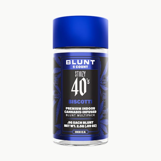 STIIIZY 40’s Mini Blunts Multipack is filled with premium grown STIIIZY cannabis and packed in individual glass vials to maintain freshness and potency. Each 40’s Mini Blunt is rolled with 100% tobacco free, kief dusted hemp wraps which packs a flavorful and potent punch with every exhale, and the tightly secured custom glass tips have been perfected to provide an amazing and consistent burn every time. The STIIIZY 40’s Mini Blunts Multipack is reinventing your high experience by being one of the first to introduce 40% THC and total cannabinoids potency with special live resin infusion. BISCOTTI · Taste: Earthy, Pine, Nutty · Feeling: Relaxing, Sleepy, Giggly · Description: An Indica-dominant strain that comes from Gelato #25 and South Florida OG. Biscotti delivers a powerful body high and delicious flavor.