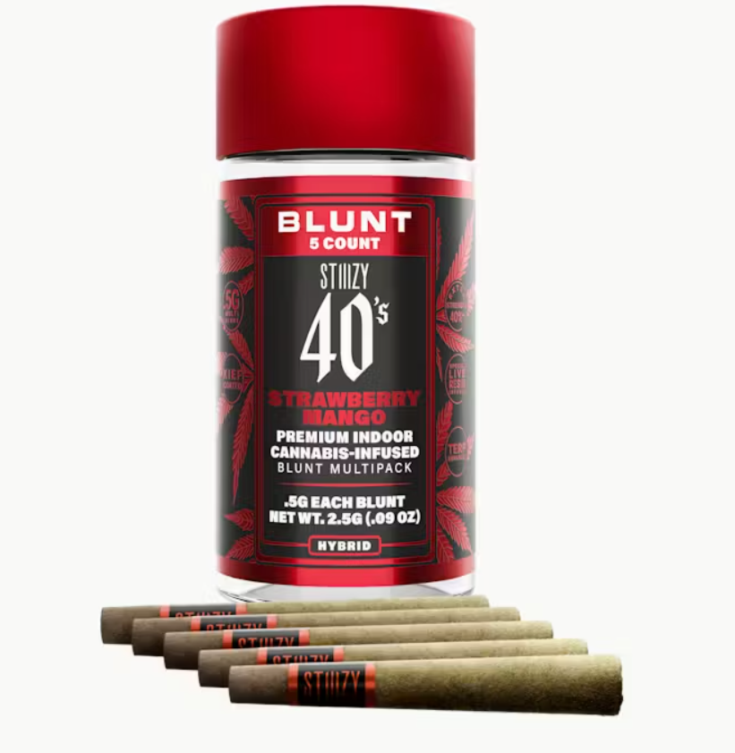 The STIIIZY 40’s Strawberry Mango 5-pack of mini blunts features five 0.5G servings of infused flower, wrapped in tobacco-free hemp and coated with kief. Each blunt delivers tropical notes and a very flavor-forward profile, true to its name, created for consistency and quality in every session.