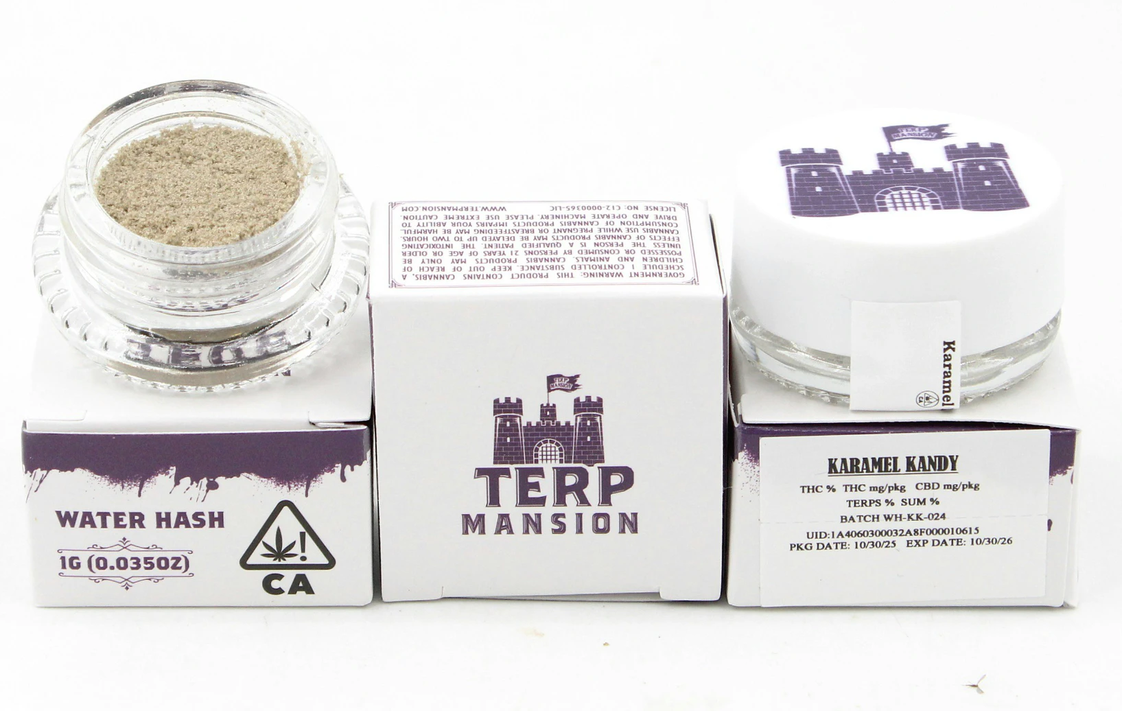 "THC 60.49% CBD 0.12% Terps 2.58% Karamel Kandy water hash delivers a bold candy-forward aroma that pours out as soon as the jar opens. Notes of warm caramel, vanilla frosting, and honey-drenched cookie dough rise up fast, rounded out by a soft gas that gives it depth without overpowering the sweetness. The flavor matches the nose with a rich, creamy inhale that melts into sugary cake and finishes with a light earthiness. It’s a smooth and flavorful expression built for those who crave loud terps, sweet profiles, and a clean, potent smoke every time."